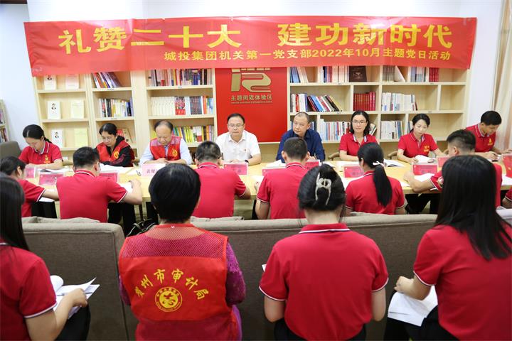 發(fā)布時(shí)間:2022-11-01 作者:圖文/吳姍 來源:本站原創(chuàng) 審核:葉茂桃 鄧永劍為深入學(xué)習(xí)貫徹黨的二十大精神,10月31日,城投集團(tuán)機(jī)關(guān)第一黨支部在市人才公寓開展“禮贊二十大建功新時(shí)代”10月主題黨日活動(dòng)。集團(tuán)黨委書記、董事長黃俊,黨委副書記、工會(huì)主席梁輝露,黨委委員、紀(jì)委書記吳澤蓮以普通黨員身份參加活動(dòng)。市審計(jì)局黨組成員、經(jīng)責(zé)分局局長黃健斌率市審計(jì)局赴城投集團(tuán)審計(jì)組成員參與活動(dòng)。支部書記湯彩燕主持會(huì)議。支部全體黨員參加活動(dòng)。