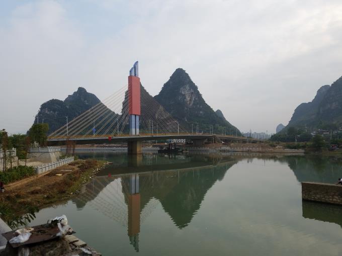 賀州市靈峰大橋工程位于八步區(qū)賀江一橋下游0.9公里處,北岸接靈峰北路,是連接賀江兩岸、緩解城市交通壓力、方便居民的重要通道之一。靈峰大橋設(shè)計全長為465.018米,其中南引道長50.448米,北引道長80.570米,引道全長131.018米,橋梁長度為334米,橋面寬度27米,按雙向四車道設(shè)計。主橋采用獨塔單索面預(yù)應(yīng)力混凝土展翅箱梁斜拉橋,邊跨跨徑68米,主跨跨徑86米,全長154米。橋面以上塔高51米,全橋設(shè)計共有77根樁基、9個承臺、7個墩身、2個橋臺。