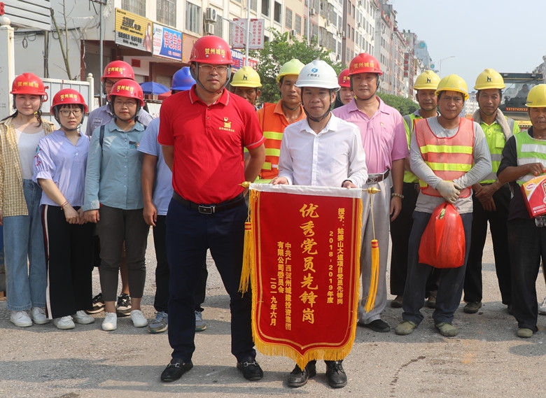 在項(xiàng)目現(xiàn)場(chǎng),蘭乾雄為戰(zhàn)斗在一線(xiàn)的工人們發(fā)放了西瓜、清涼飲料,并與工人代表拉起了家常,一一詢(xún)問(wèn)了工人的家庭、收入及工資發(fā)放等情況。他說(shuō)到,正是因?yàn)橛幸痪€(xiàn)工人們的努力和堅(jiān)守,我們的一些重點(diǎn)工程和項(xiàng)目才能順利向前推進(jìn),他們是最值得尊敬的人。同時(shí),蘭乾雄為姑婆山大道項(xiàng)目頒授了“2018-2019年度優(yōu)秀黨員先鋒崗”旗幟,肯定了他們?yōu)轫?xiàng)目建設(shè)的付出,鼓勵(lì)他們繼續(xù)充分發(fā)揮黨員先鋒崗先鋒模范作用。