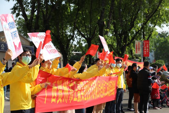 下午16點(diǎn)整,載著賀州支援湖北醫(yī)療隊(duì)的大巴車在33輛摩托車鐵騎、兩輛警車的引導(dǎo)護(hù)航下駛?cè)胭R州大道,警燈閃爍、警笛嘹亮,沿途市民揮舞國旗,夾道歡迎,高聲歡呼,壽城人民用最高禮遇,最深敬意,迎接英雄凱旋,表達(dá)對英雄的敬意。