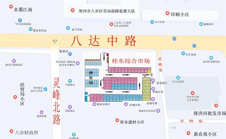 地址位于賀州市八達(dá)中路32號(hào),地理位置優(yōu)越,在靈峰北路與八達(dá)中路交界處,屬賀州市城區(qū)雜貨批發(fā)商圈核心,一墻之隔有三大電信運(yùn)營(yíng)商,人流密集、交通便利。