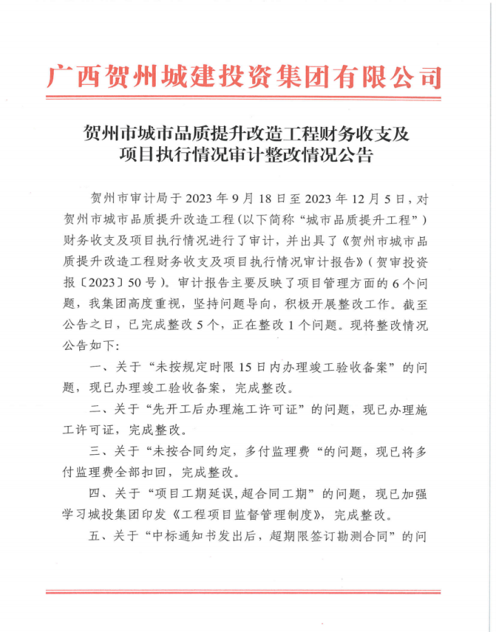 廣西賀州城建投資集團有限公司2022年度財務收支情況審計整改情況公告2024-03-27