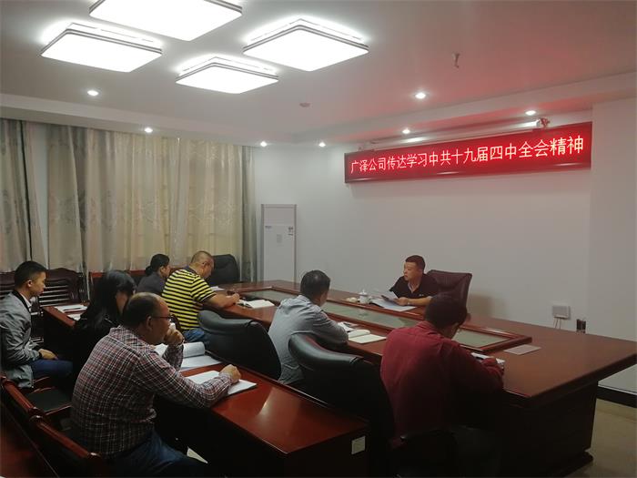 黨的十九屆四中全會召開后,廣澤公司黨支部迅速行動,于11月6日召開了黨員大會,傳達學習《中國共產黨第...